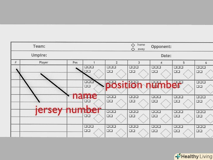 - Коли гравці зайняли свої позиції, запишіть їх імена, номери і позиції під гравцями, замість яких вони вийшли і відзначте іннінг, в якому це сталося. також зробіть позначку в клітині іннінга в правій частині клітини.
