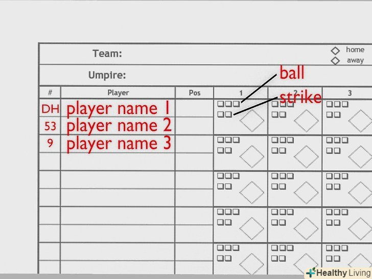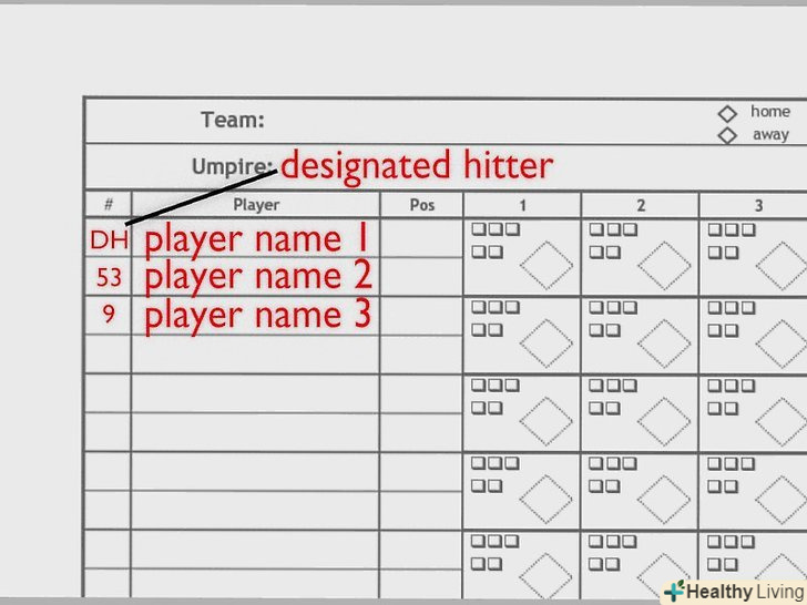 - Якщо гравець грає на позиції хіттера, в першій клітці напишіть DH, а в другому позицію гравця.
