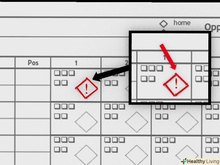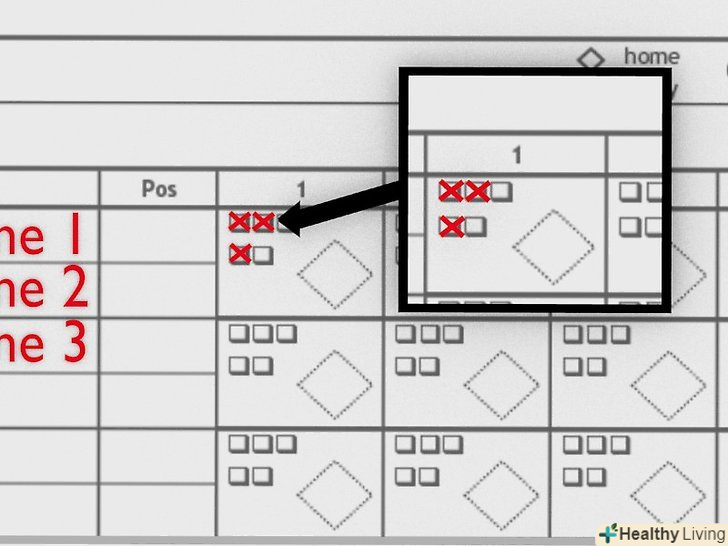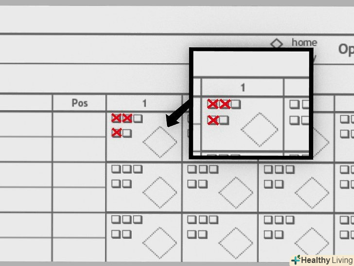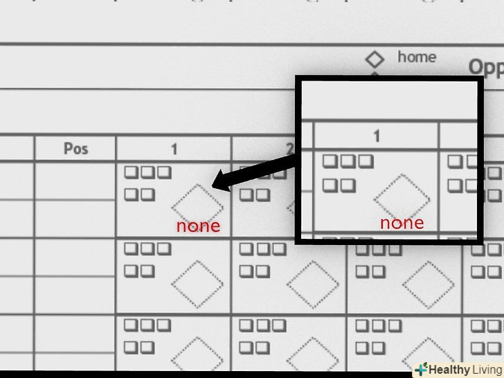 - Ви можете використовувати для відміток точки, слеші, хрестики, цифри або будь-які, зручні для вас, знаки. Деякі люди використовують різні слеші і хрестики, щоб відзначити вибив м'яч беттер або торкнувся м'яча, а інші цифрами позначають, в якій послідовності робили кидки пітчери. Це особливо корисно, тому що так, інші можуть побачити, як розвивалися події з б'ють битою.