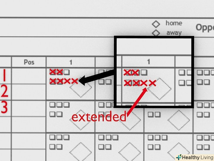 - Якщо фал-бол відбивається з двома страйками, просто поставте крапку (або цифру, в залежності від того, як ви відзначаєте), яка буде виділятися з лінії страйків. При необхідності, продовжуйте і далі так відзначати.