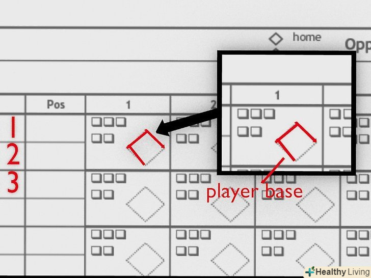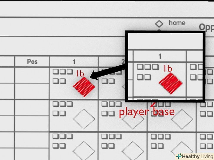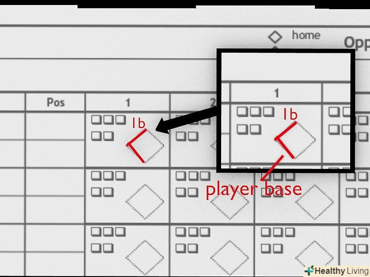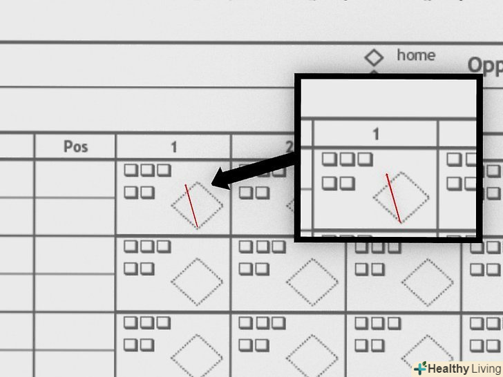 - Якщо беттер першим потрапив на базу, в маленькому ромбі малюйте прямі лінії, вказуючи маршрут беттера. Збоку від лінії залиште скорочення маленькими літерами.