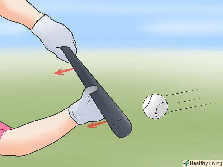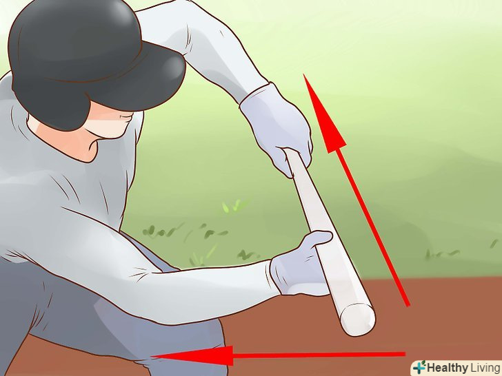Як тільки пітчер потрапить, почне рухатися в вашу БАНТИНГ позицію. поставте свою руку, ту якої Ви зазвичай б'єте. Повільно переміщайте верхню руку туди, де біта починає потовщуватися. Стовбур біти повинен бути нахилений трохи вгору, під кутом 30 ° до 45 ° від землі. Стовбур повинен лежати вище руки.- Якщо хапаєтеся за стовбур біти, не забудьте вхопитися вашими великим і вказівним пальцями міцно за стовбур. Ви не повинні робити так, щоб пальці стирчали і ви, звичайно, не повинні братися за передню частину біти - ту частину, яка найближче до пітчера - блокувати надмірно пальцями.