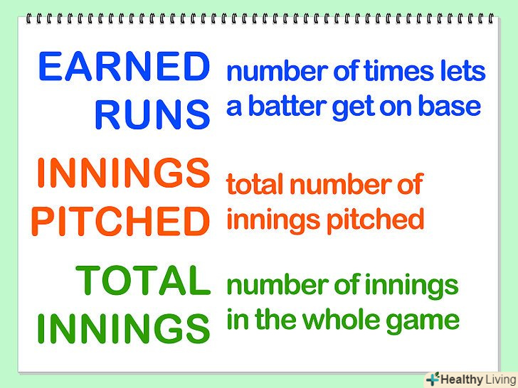 Ви повинні знати, які показники потрібні для підрахунку середньої кількості ранів. Вам потрібно три складових: пропущені рани, число зіграних інінгів і загальна кількість інінгів.- Пропущені рани, як пояснювалося раніше, це кількість разів, скільки пітчер дозволив б'ючому дістатися до бази. Вважається кількість за всю гру.