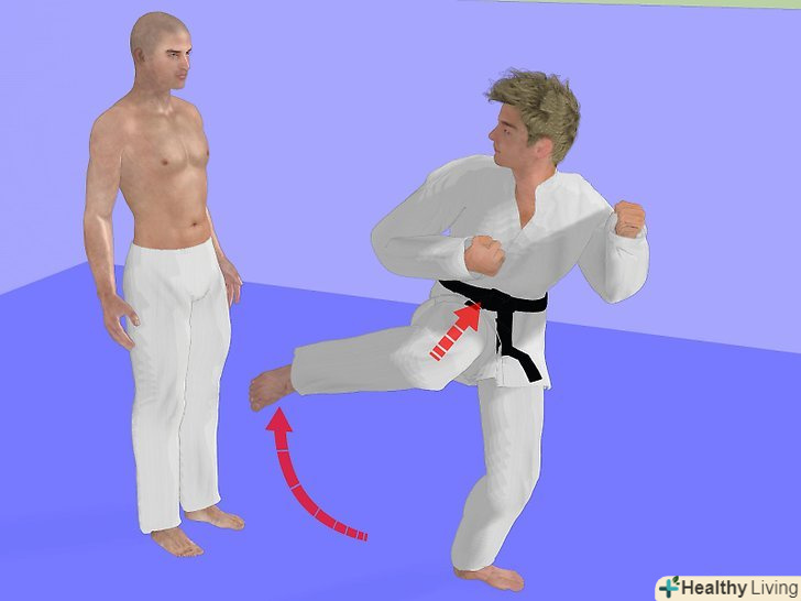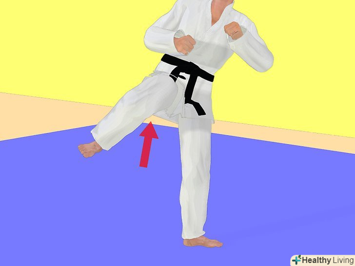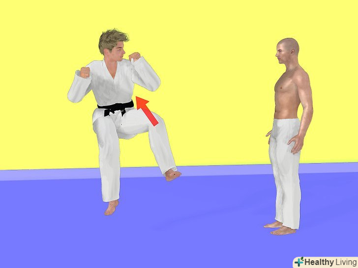 Підніміть переднє коліно до грудей. від цього зігнутого коліна залежить сила удару, так що підніміть його якомога вище.