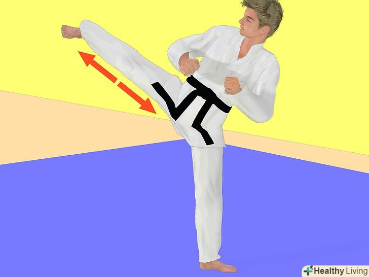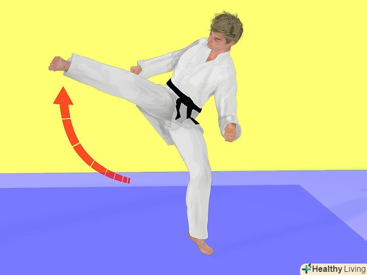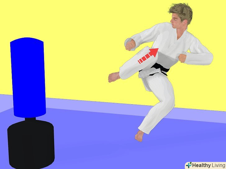 Випряміть коліно при ударі. випряміть його в самому кінці удару. Розрахунок часу дуже важливий. Тому потрібно якомога більше тренуватися, щоб зуміти правильно розрахувати час нанесення удару.- Ударна міць безпосередньо залежить від випрямлення коліна в потрібний час. Ви повинні перебувати на достатній відстані від мети, щоб зуміти розпрямити ногу, але не настільки далеко, щоб лише злегка зачепити ціль.