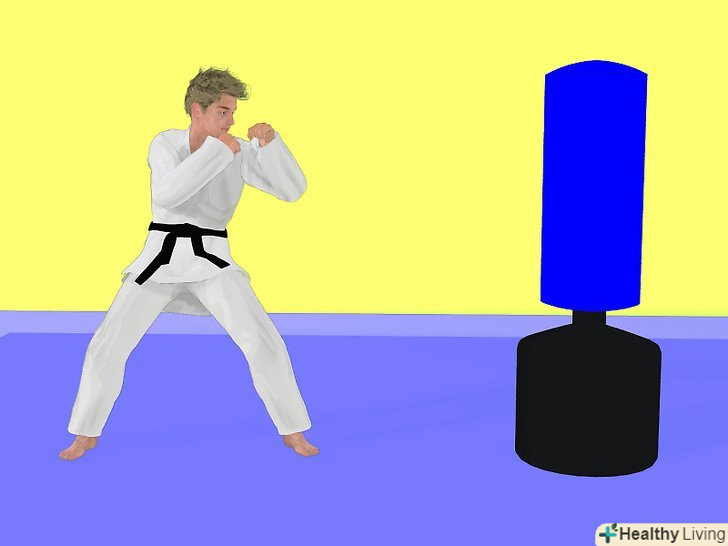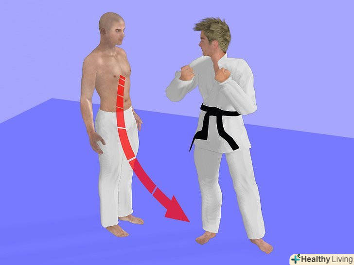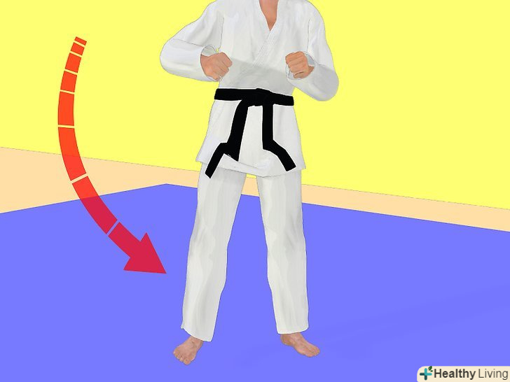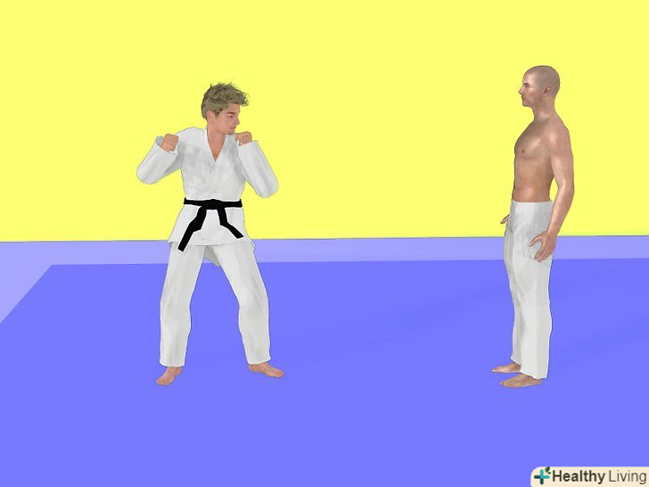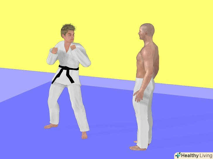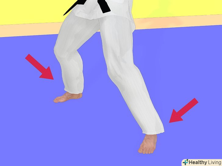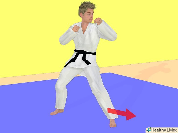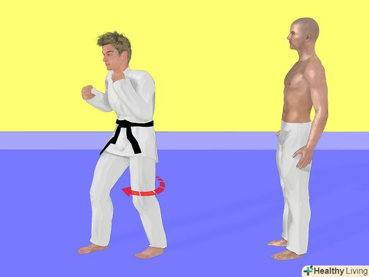 Поверніть тіло і стопи боком. пізніше, коли ви будете наносити удар, це дасть вам перевагу. Підігніть коліна так, щоб вам було легко переміщатися з цього Положення. [2]