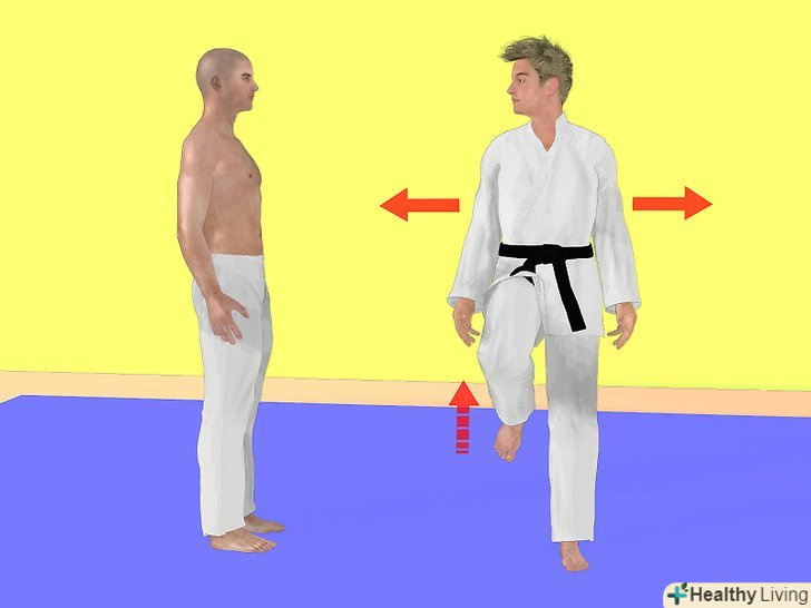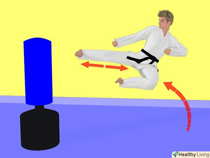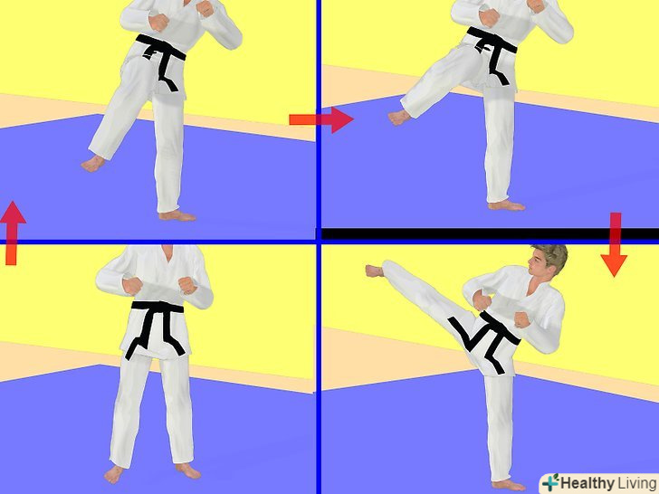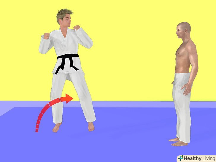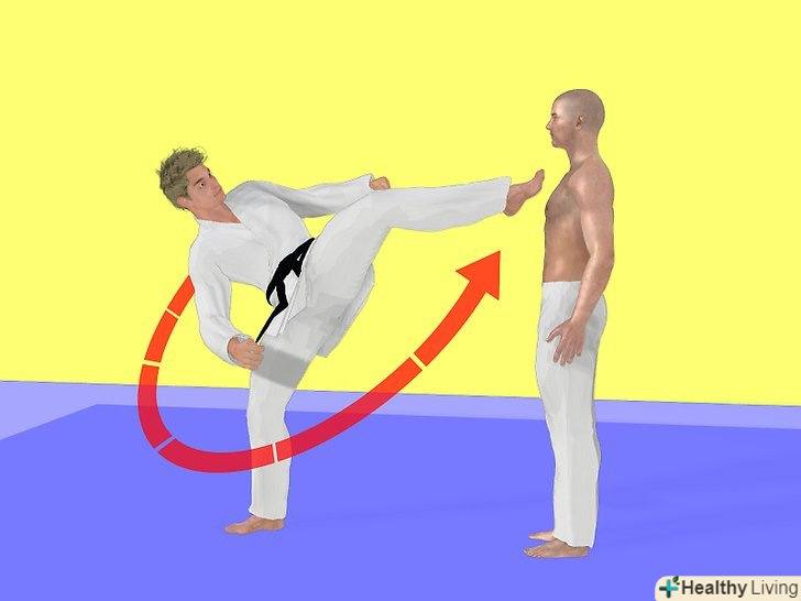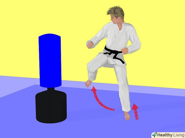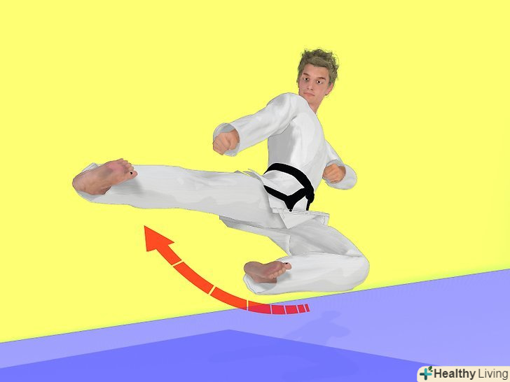 Відштовхніться опорною ногою і підніміть б'є ногу. стійко поставте опорну ногу (передню ногу) і відштовхніться нею, щоб відірватися від землі. Коли відштовхнетеся, відхиліть тіло в сторону, щоб витягнути вперед б'є ногу.- Також потрібно підняти і опорну ногу, щоб ваш противник не зміг її відкинути в сторону.