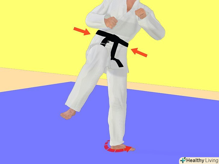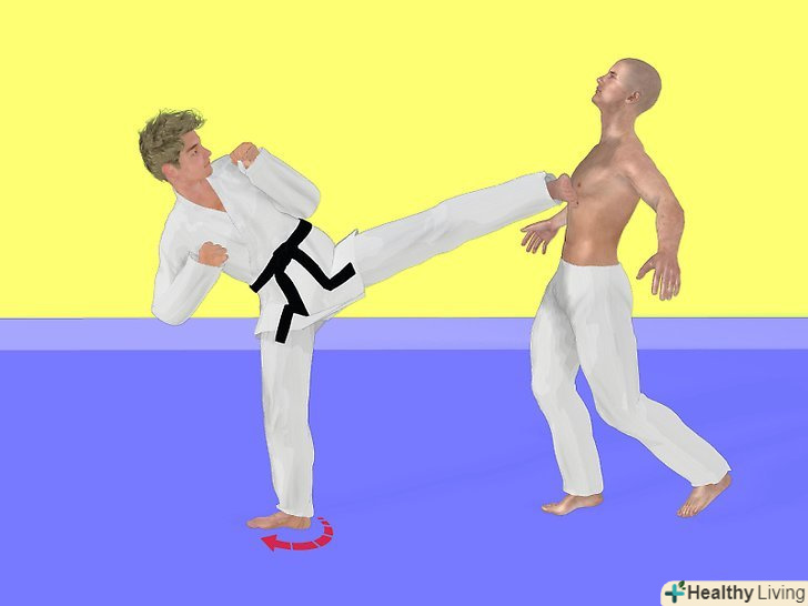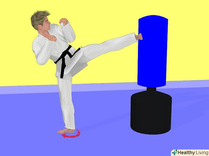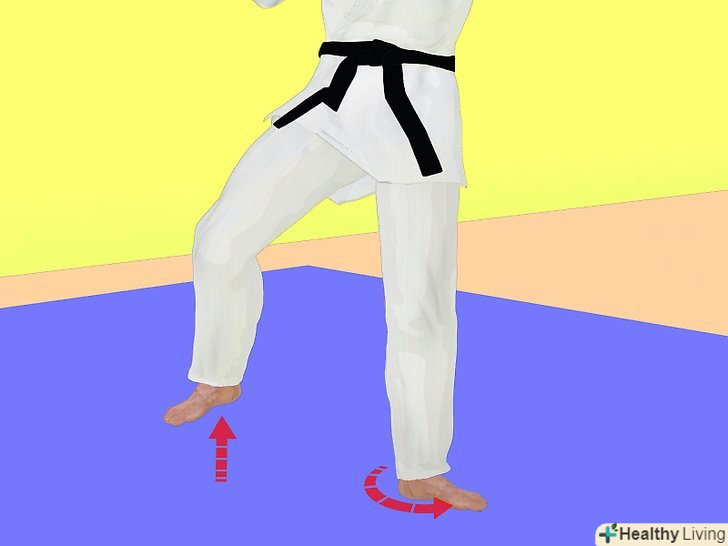 Поверніть стопу, щоб за рахунок м'язів стегон посилити удар. повертаючи повністю стопу, ви виставляєте стегна так, щоб з потрібного положення нанести удар стопою. Завдяки цьому повороту бічний удар ставати могутніше.- Після повороту ви можете відштовхнутися цією стопою, щоб за допомогою м'язів стегна, сідниць і основних м'язів завдати удару по цілі.