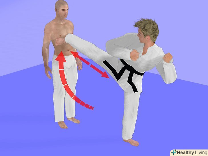 Нанесіть удар зовнішнім ребром стопи або п'ятою. Ребро стопи і п'ята-це найсильніші частини ноги. П'ята-особливо сильна частина тіла, так що якщо ви збираєтеся нокаутувати, то бийте саме п'ятою.- Удар ребром (або зовнішнім краєм) стопи також ефективний, при цьому щиколотка пом'якшує вплив удару.