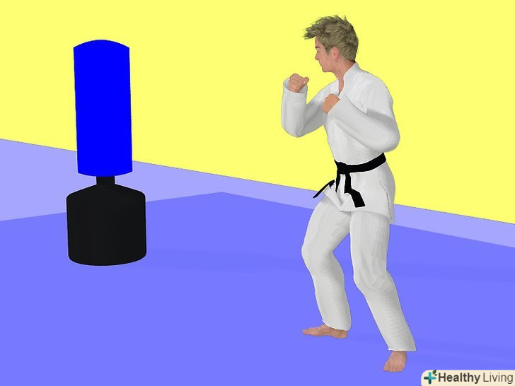 Займіть боксерську стійку. поставте ноги трохи більше, ніж на ширину плечей, одну ногу попереду, а іншу позаду. Б'є нога повинна бути попереду. Тримайте кулаки піднятими перед обличчям.- Потрібно тренуватися обома ногами, тому пробуйте займати різні положення. Після відпрацювання удару однією ногою, поміняйте стійку і попрацюйте також над ударом іншою ногою.