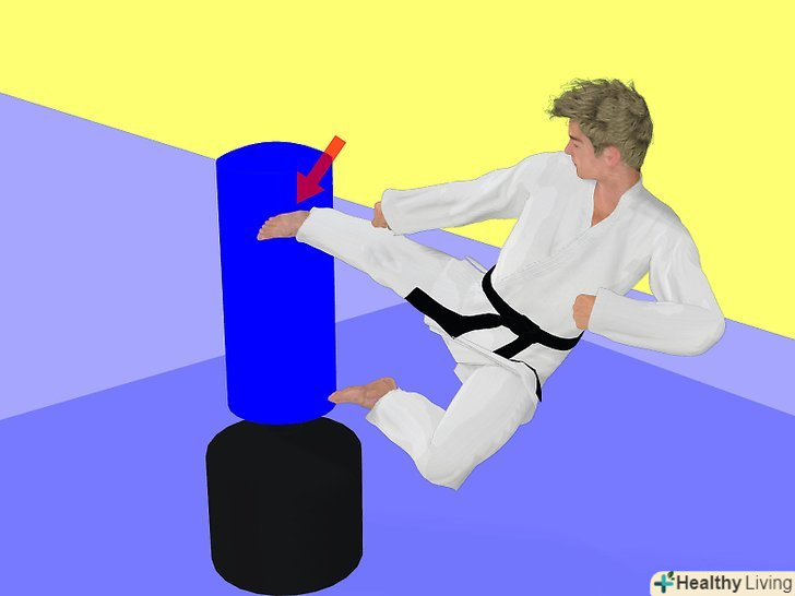 Випряміть коліно, щоб нанести удар по цілі. випряміть коліно, щоб вдарити по цілі і вразити її. Зазвичай ціляться в область грудей, але ви можете цілитися також і в інші місця.- Ви повинні вдарити ребром (зовнішнім краєм) стопи або п'ятою. У цих місцях зосереджується вся сила удару.