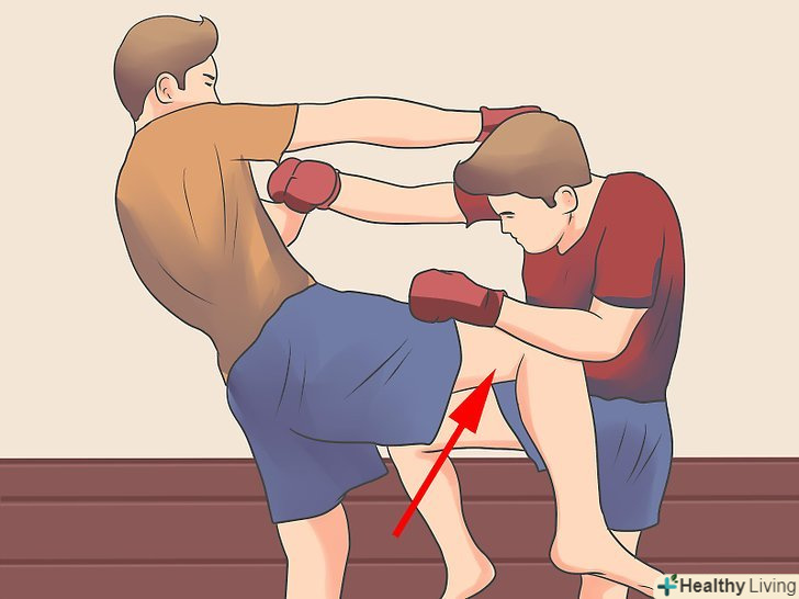Напад накиданням коліна. Один з кращих способів захисту в боротьбі проти захоплення ніг – це жорсткий удар коліном в голову. Це швидкий спосіб виграти бій руйнівним ударом. Оскільки ви знаєте це, можете спробувати одночасно накинути коліно під час нападу, але робити це дуже швидко.- Практикуйте напівнапади, в яких ви оманливо нападаєте здалеку, тримайте погляд на коліні опонента весь час, щоб переконатися, що ви відповісте нападом при ударі противника. Як тільки ви бачите його в повітрі, поверніться назад в стійку атаки і закінчите розпочату роботу. Ваш опонент буде вже поза балансу з однією ногою в повітрі.