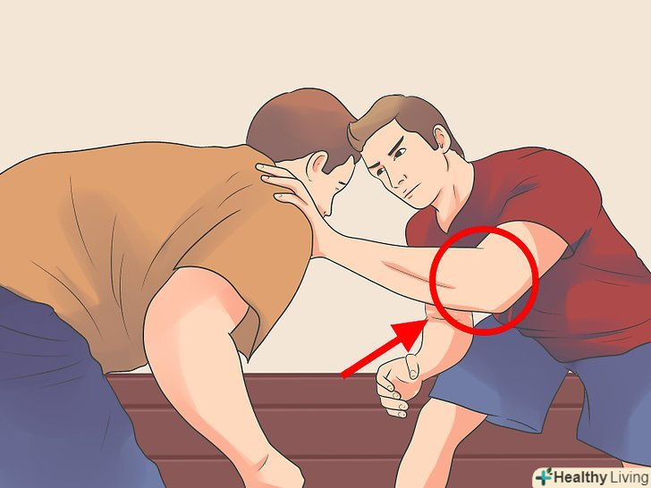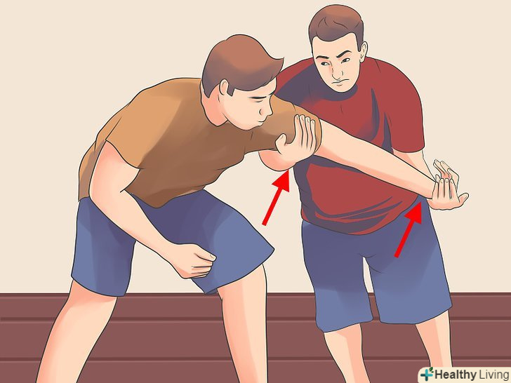 Почніть з російського способу заведення рук за спину. ще один ефективний метод нападу за допомогою кидка з подвійним захопленням ніг - це російський спосіб закладу рук за спину, який дозволить вам зв'язати руки вашого супротивника і відкрити нижню частину тіла для захоплення ніг. [4]- Коли ваш противник спробує захопити вашу голову однією рукою, Схопіть його передпліччя бейсбольною хваткою, обіймаючи його і закриваючи ваше тіло від рук за спину. Природний інстинкт вашого супротивника буде відштовхувати вас з іншого боку, в цей момент ви можете нагнутися, витягуючи захоплену руку іншою рукою, заплутуючи їх і звільняючи. Впадіть для здійснення кидка з подвійним захопленням ніг.