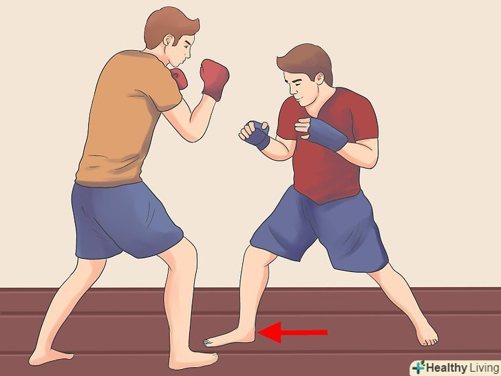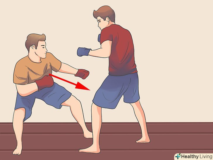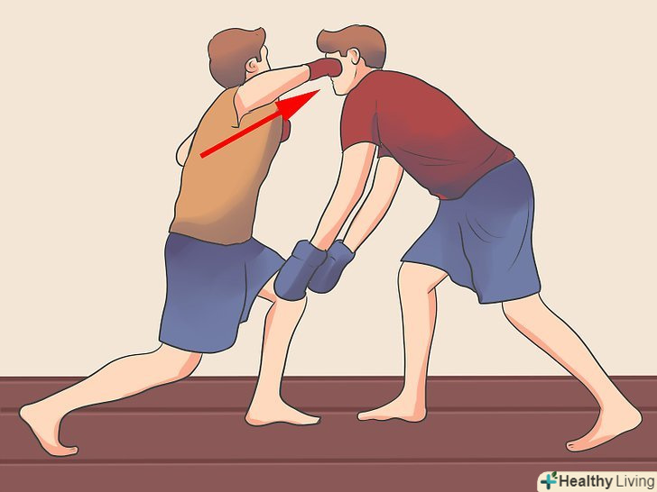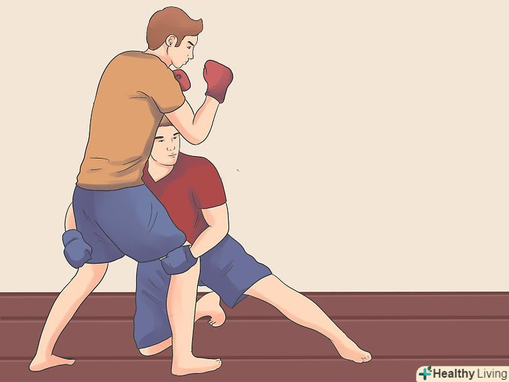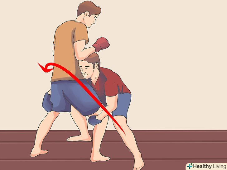 Почніть кидок із захопленням ніг з удару. Одним з найбільш правильних і поширених способів зробити кидок з подвійним захопленням ніг, є удар по голові вашого супротивника, так щоб його руки піднялися вгору в оборонну позицію, а потім вже робити кидок із захопленням ніг. [3] . У той час як ви все ще залишаєтеся вразливим до удару коліном або задушення, ви можете обійти захист вашого опонента, якщо зробите це досить швидко.- Крім того, обманний кидок із захопленням ніг-це іноді хороший спосіб відкинути руки вашого супротивника, щоб відкрити його для ударних атак.
