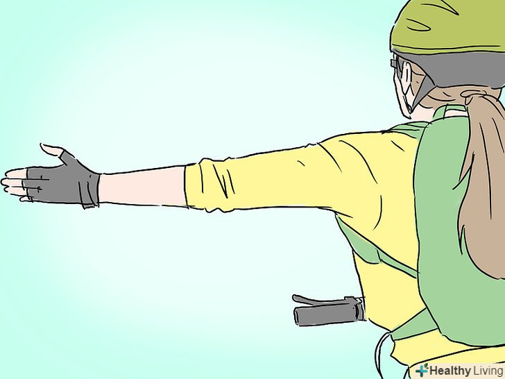 Чітко подавайте сигнали рукою. сигнали руками необхідні при поворотах. Це особливо важливо при повороті наліво, тому що в цьому випадку справа стосується руху на пересічних курсах. Забудьте те, чого вас навчали в початковій школі; замість цього, якщо ви повертаєте ліворуч, витягніть ліву руку, а якщо повертаєте направо, витягніть праву руку. Сигнали були колись взяті з правил водіння автомобілем, в цьому випадку водій міг висунути з вікна тільки ліву руку, щоб показати поворот.