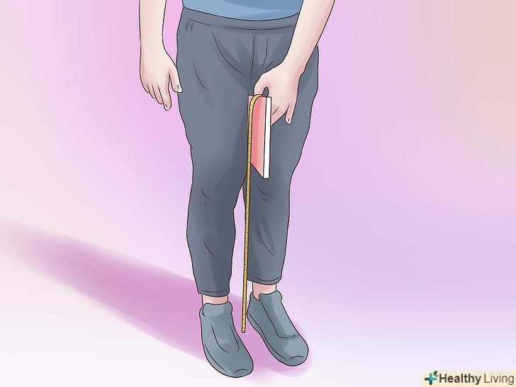 Виміряйте довжину ніг по внутрішній стороні. Для того щоб дізнатися який розмір велосипеда підходить саме вам (довжина підсідельної труби), почніть з вимірювання довжини ніг по внутрішній стороні. Для цього:- Встаньте прямо спиною до стіни, затисніть книгу між ніг.