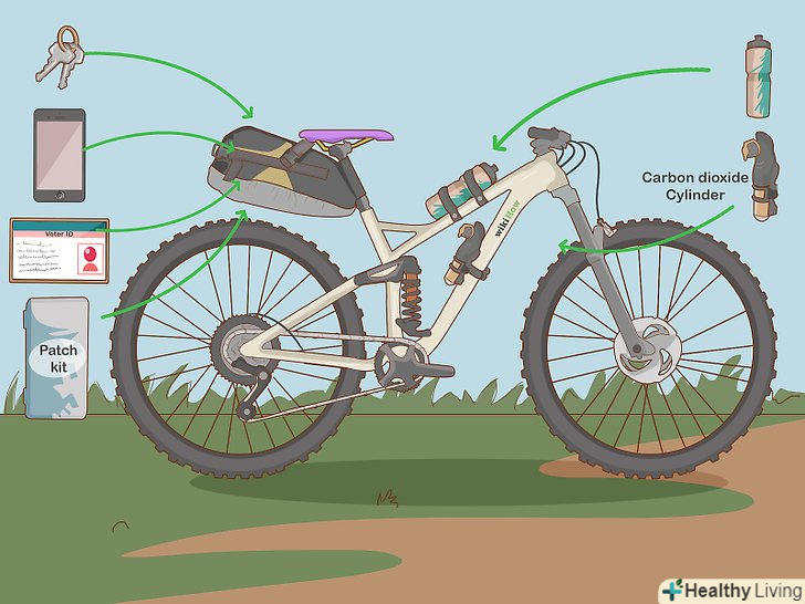 Купіть необхідні аксесуари. якщо ви будете кататися по дорозі, вам необхідний шолом. Шолом повинен підходити вам за розміром. [8] важливо також возити з собою набір для ремонту на той випадок, якщо у вас проб'є або спустить колесо. [9] якщо ви маєте намір паркувати велосипед на вулиці, купіть замок. [10]