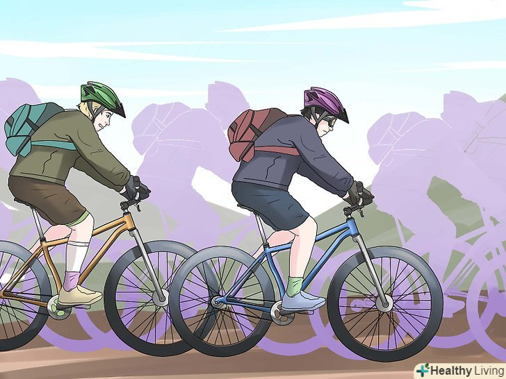 Будьте у формі. гірський велосипед є частиною прогулянки по лісі, частина аеробних вправ і частина велошоу. Крім хорошого велосипеда, здорове тіло буде вашою найважливішою частиною спорядження. Ви ж не хочете вийти з середини стежки на крутих схилах, тому що ви занадто втомилися, і йти пішки назад. У той час як більшість гірських велосипедистів, навіть досвідчених, часто катається на велосипедах і сходить на особливо складних поворотах, краще залишитися на своєму велосипеді і зберегти свій імпульс. Занадто часті зупинки і нові старти, тому що ви не в формі, в кінцевому рахунку, зроблять поїздку більш важкою.- Якщо ви останнім часом не їздили часто, але хочете почати катання на гірському велосипеді, спробуйте зробити кілька тривалих поїздок, щоб знову відчути себе комфортно. Пройдіть кілька кілометрів, чергуючи їзду і спринт, щоб повернути себе в хорошу форму для їзди на велосипеді.