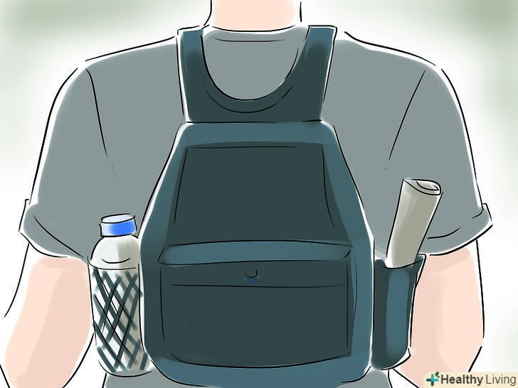 Зберіть рюкзак. вам знадобиться зібрати рюкзак, який ви візьмете з собою і велосипедні кошики, в яких ви рівномірно з обох сторін зможете розкласти свій багаж. Що саме ви візьмете з собою? У ваших сумках має бути наступне:- Їжа. Консервовані продукти підходять найкраще, тому що вони не псуються. Ви можете взяти бутерброди, які покладіть в охолоджувальний контейнер, щоб зберегти їх свіжість в спеку. Енергетичні батончики, фрукти, горіхи і зерна забезпечать вас енергією. І завжди беріть з собою гроші, щоб купити що-небудь по дорозі. Якщо це хороший сезон, у дороги можете пошукати ягоди і т.д., але робіть це тільки якщо ви знаєте, що ягоди можна їсти (вони не отруйні, і не постраждали від вихлопних газів). Будьте уважні і не рвіть ягоди на фермі. На багатьох фермах їх можна дешево купити, так що спробуйте такий варіант. До речі Ви ніколи не зможете з'їсти занадто багато – вам знадобиться дуже багато енергії.