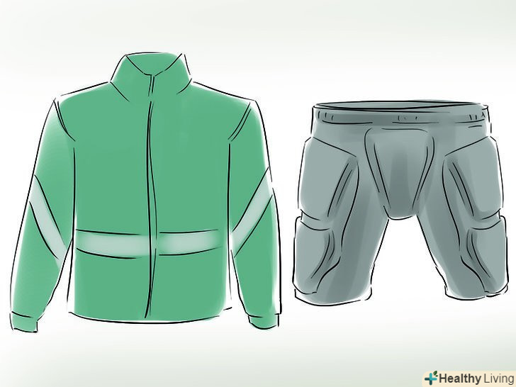 Правильно одягайтеся. якщо ви спробуєте їхати на велосипеді, надівши джинси і сорочку, далеко ви не поїдете. Так само ви можете отримати травму, коли будете падати, не кажучи вже про те, що вас погано буде видно. Рекомендований одяг-захисні шорти і світловідбиваюча куртка. Якщо ви впадете, шорти захистять вас від травми, а водіїв автомобілів замінять вашу відбивну одяг. Якщо у вас немає світловідбиваючого одягу, підійдуть яскраві кольори, до того ж ви можете дуже просто зробити яскраві світловідбиваючі наклейки.- Майте спорядження на випадок дощу. Велосипедні дощовики закривають спину і всю верхню частину тіла, вони будуть облягати вас завдяки еластичній матерії. У теплу пору року ви переживете мокрі ноги, але задумайтеся над покупкою водонепроникних штанів. Будь-яка куртка на вас повинна бути яскравою і світловідбиваючою, особливо дощовик.