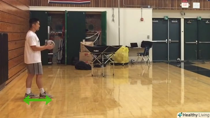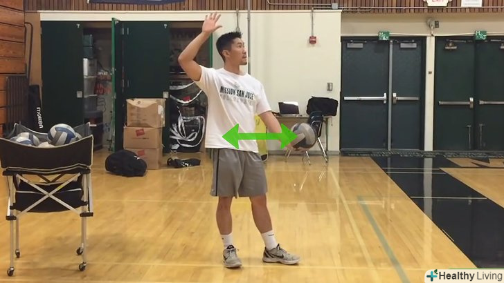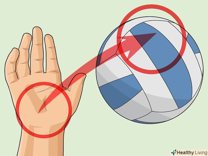 Тримайте м'яч перед собою. розташуйте не домінуючу руку перед собою. Руку тримайте рівно, але злегка зігніть її в лікті. Долоня повинна бути спрямована вгору, а м'яч – лежати на ній. [3]- Ви також можете накрити м'яч рукою, що подає.