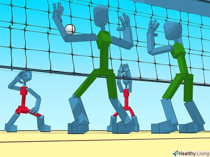 Підстрибніть навпроти подає гравця, широко розвівши пальці рук і напружуючи їх. найкраще блокувати удар твердою частиною руки, тому витягніть великі пальці і розведіть інші.