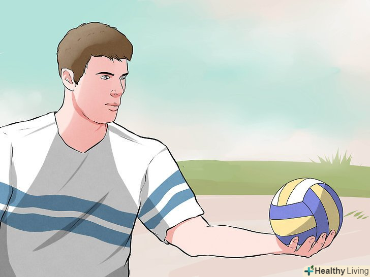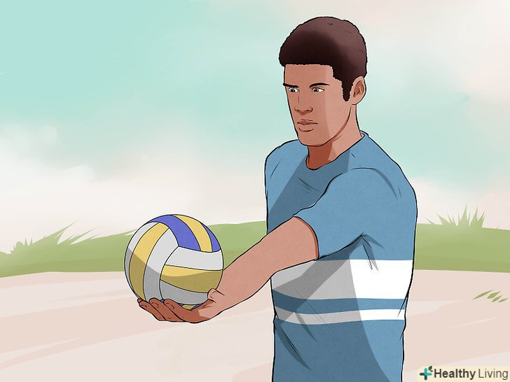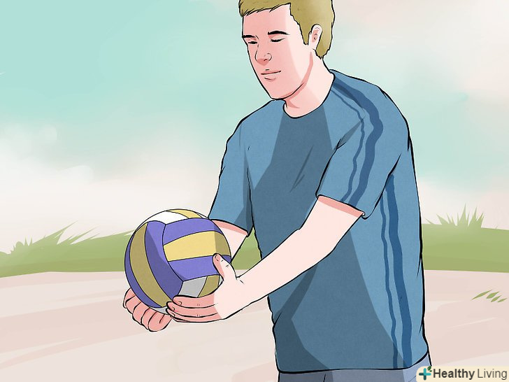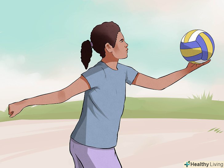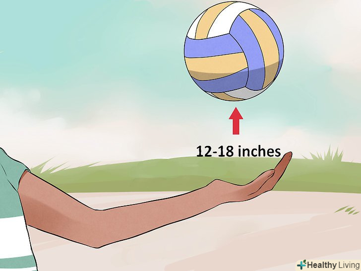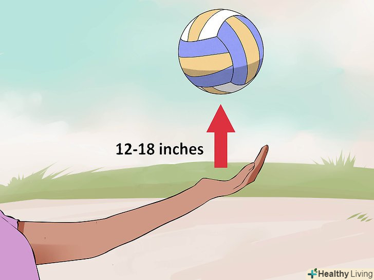 Підкиньте м'яч. почавши робити третій крок, неведущей рукою підкиньте м'яч в повітря на 30-45 сантиметрів.- Щоб потрапити в центр м'яча і зробити хорошу подачу, підкидайте м'яч не в сторону, а прямо перед собою.