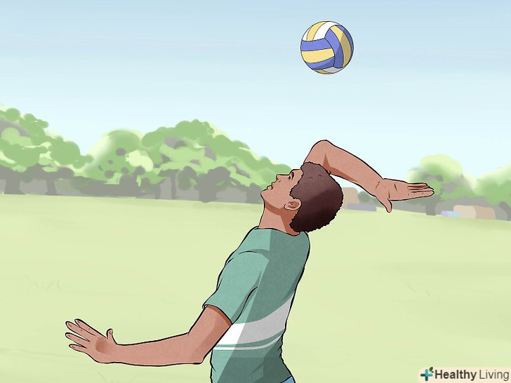 - Коли м'яч підлетить у верхню точку, нахиліться вперед і вдарте по ньому. Щоб надати сили удару, використовуйте ривок руки і торсу.