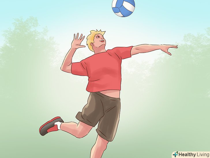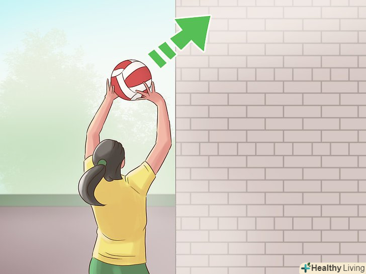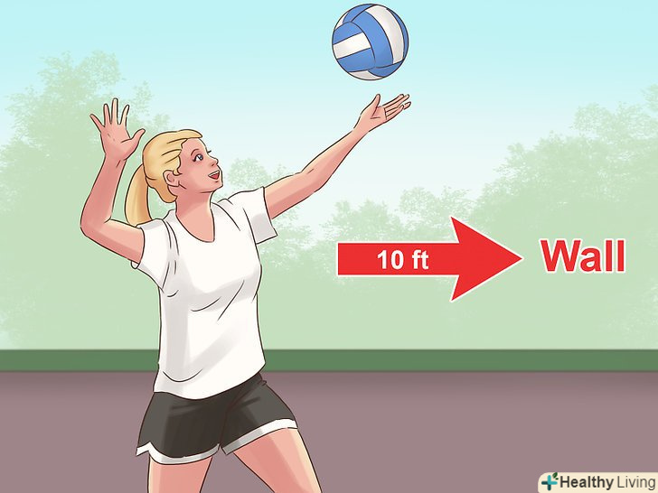 Подача в стіну. Станьте за 10 – 15 футів (3-4,5 м.) від стіни. Киньте м'яч вище над головою трохи перед вами. Потім подайте його в стіну. Ваші подачі повинні бути красивими і високими, і повинні проходити по одній траєкторії. Ви можете або зловити м'яч і повторити, або можна просто подавати м'яч так, щоб він відскакував до вас.