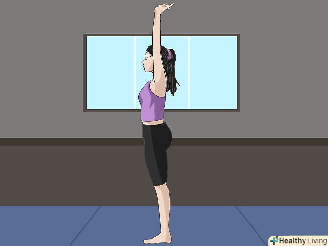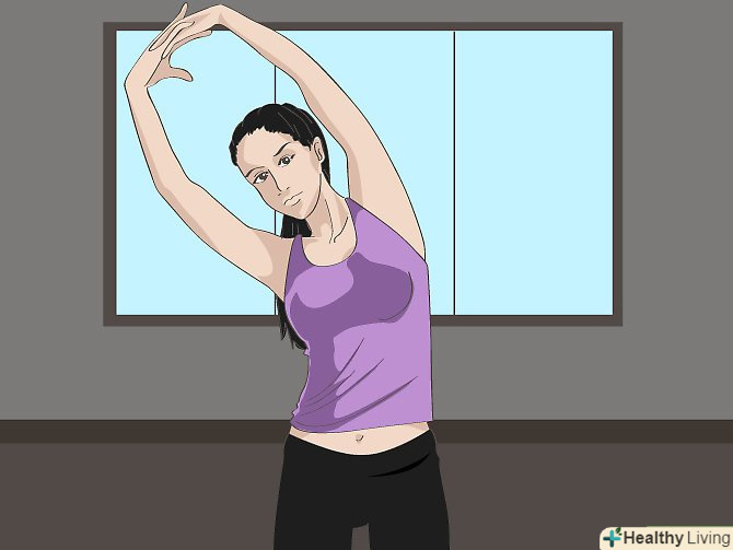 Виконайте нахили в сторону, щобРозім'яти верхню частину тіла . Встаньте в положення стоячи, підніміть руки над головою, скріпіть разом пальці обох рук, залишивши вільними лише вказівні. Вдихніть і витягніть своє тіло якнайдалі, при цьому роблячи нахил в сторону. Протягом 5 секунд дихайте повільно і глибоко , після чого поверніться у вихідне положення. [4]- Виконайте нахили в обидві сторони.