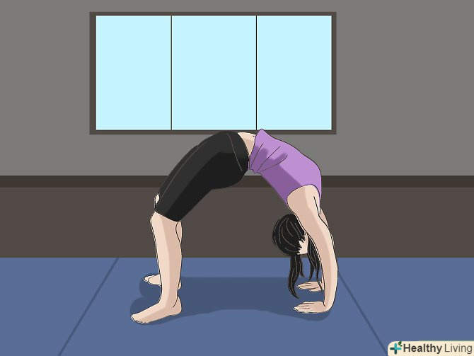 Зафіксуйте руки на підлозі. як тільки ви почнете наближатися до підлоги, зафіксуйте свої руки, щоб при приземленні не вдаритися головою. Зафіксувавши руки, продовжуйте опускатися, поки ваші долоні не опиняться на підлозі. [15] будучи в позиції, ваш живіт повинен бути зігнутий і спрямований вгору до стелі.- Будучи в містку, ви повинні твердо стояти на підлозі. [16] вся ваша вага повинна бути рівномірно розподілена на всі чотири кінцівки. Це допоможе вам утримувати рівновагу.