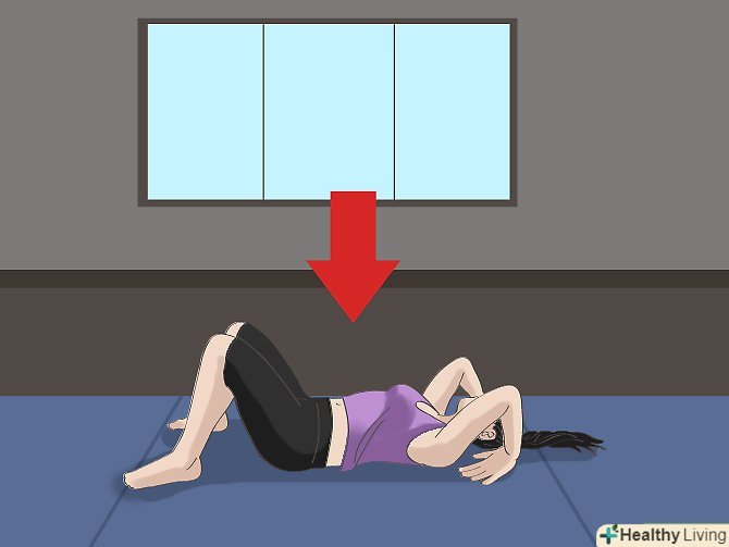 Нахиліться назад. Випніть груди і повільно почніть опускати спину. Не поспішайте і стежте за своїми рухами. Якщо ви будете робити все занадто швидко, то можете втратити рівновагу, впасти і навіть травмуватися. [13]- Якщо вам важко опуститися самому, поставте поруч стілець або стіл і використовуйте їх в якості опори. Використовуйте ці предмети в якості опори до тих пір, поки не будете впевнені, що зможете опуститися самостійно.