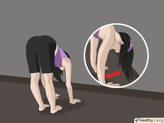 Покладіть руки на підлогу. Тримайте руки на ширині плечей, пальцями в напрямку стіни. Ваші руки повинні знаходитися на відстані 10-15 сантиметрів від стіни. [17] підготуйтеся до виконання вправи, подумки уявивши собі рух і зосередившись на диханні.- Ваші руки повинні твердо стояти на підлозі. Якщо під час переходу в стійку ваші руки будуть хитатися або трястися, це може привести до падіння. [18]