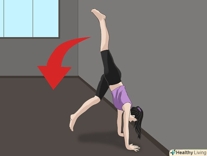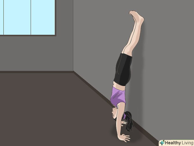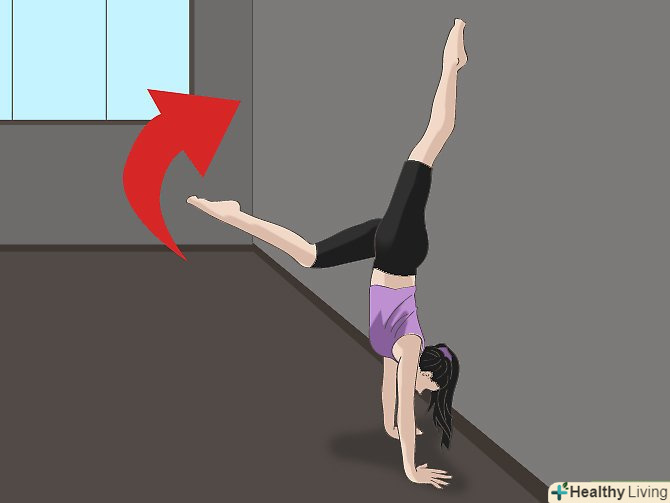 Упріться руками об підлогу і зробіть мах ногою вгору. зіпріться спиною об стіну, щоб не впасти. Потім зведіть ноги разом і розправте їх. [20] не засмучуйтеся, якщо вам доводиться повністю лежати на стіні. Напружте м'язи живота і рук і тримайте спину прямо.