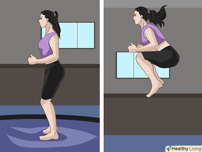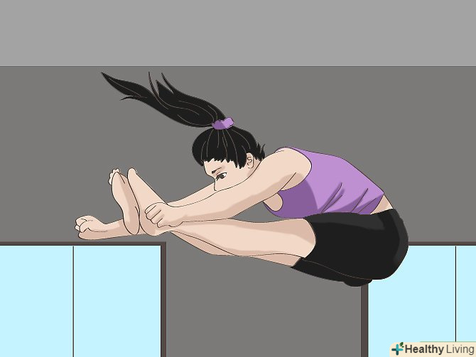 Стрибок в зігнутому положенні. стрибніть на центр батута і якомога сильніше відштовхніться від нього ногами. На піку стрибка ваші руки повинні бути піднятими над головою і спрямованими до стелі. Висуньте руки вперед, одночасно піднімаючи перед собою ноги. Випряміть ноги і спробуйте доторкнутися до шкарпеток. Опустіть вниз ноги і поверніть руки на стегна, щоб приготуватися до приземлення. [28]