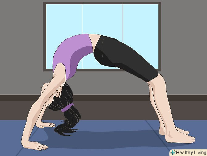 Станьте на місток, щобРозтягнути спину . акробатичний місток-це вид розминок вправ, при якому ви витягаєте своє тіло у вигляді містка. Ляжте спиною на підлогу, зігніть ноги в колінах, поставте підошви стоп повністю на підлогу, а потім розставте долоні рук так, щоб пальці вказували в сторону ніг. Ви будете виглядати так, ніби зараз поповзете на спині, але замість цього повинні будете виштовхнути руками і ногами верхню частину тіла. [2]- Ваші лікті повинні бути вирівняні, а спина – бути якомога більш витягнутою. З часом ваша гнучкість покращиться, і ви помітите, як зможете згинати свою спину все більше і більше.