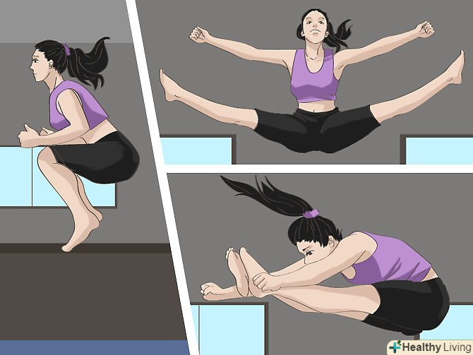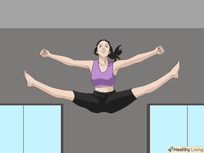 Стрибок з ногами нарізно. стрибайте на центр батута, а потім відштовхніться від батута ногами. На піку стрибка ви повинні підняти ноги і розвести їх в сторони. Одночасно з цим Зігніть спину і спробуйте дотягнутися до шкарпеток. Як тільки почнете опускатися, вам необхідно буде згрупуватися. Для цього ви повинні звести ноги разом і повернути руки на стегна. [27]