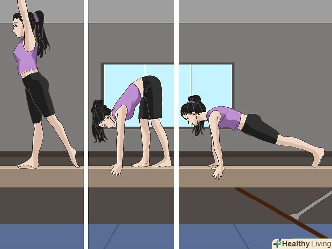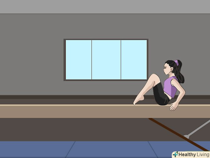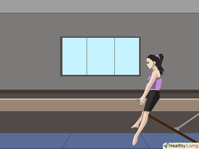 Підніміться на гімнастичну колоду на випрямлених ногах. після того, як ви залізете на колоду, поставте ногу з кожного боку. Тримайте ноги рівно, а носок направте в сторону підлоги. Тримайтеся за колоду, щоб не впасти, при цьому ваш корпус і руки повинні утворювати пряму лінію. [30]