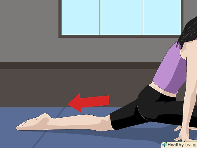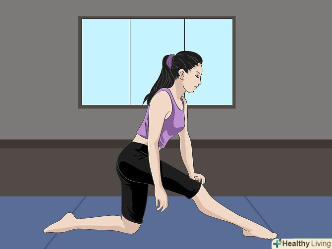 Витягніть задню ногу. одночасно з передньою ногою почніть витягати і задню ногу. Залишаючись у вертикальному положенні, почніть витягати другу ногу назад. Як тільки ви відчуєте напругу в районі стегон, перестаньте опускатися нижче. [7] якщо ви спробуєте опуститися нижче, це може призвести до травми.- При необхідності можете поставити поруч стілець або стіл, щоб можна було за них триматися, коли будете опускатися в шпагат.