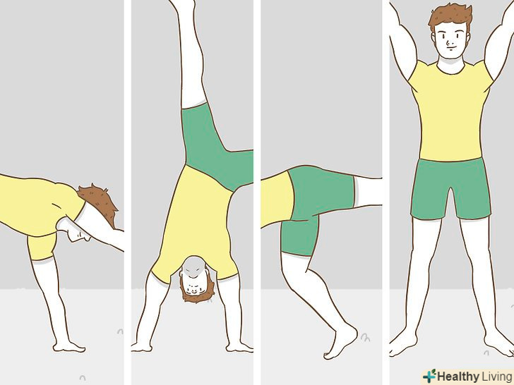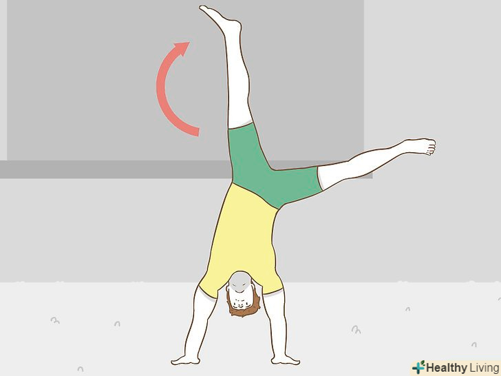 Розташуйте провідну руку на підлозі перед собою до початку перевороту головою вниз, наприклад, якщо ви починаєте вести правою стопою, то спрямуйте вашу праву руку вниз, поки та не торкнеться землі далеко попереду тієї відстані, на яке витягувалася стопа правої ноги. у той час як ви замахуєте своєю рукою, ваша ліва нога повинна починати йти вгору. Просто відштовхніться від вашої задньої ноги для підтримки.