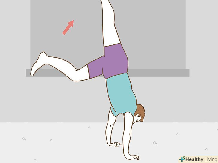 Розмістіть вашу другу руку на землі і витягніть вашу ногу вгору. добре відштовхніться від підлоги. Вам доведеться тримати рівновагу на руках, використовуючи ваші плечі і тулуб для підтримки, як при стійці на руках; ноги - у формі латинської букви V. Пам'ятайте, що вам не потрібно буде зберігати це положення в нерухомому стані, так як колесо передбачає плавне і безперервний рух.- Ваші руки повинні бути випрямленими, зібраними і стійкими.