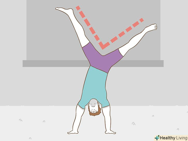 Розтягніть ваші ноги нарізно в повітрі. як тільки обидві руки торкнуться підлоги, вам доведеться тримати рівновагу на руках, використовуючи ваші плечі і тулуб для підтримки, як при стійці на руках, ноги – у формі латинської букви V. Пам'ятайте, що вам не потрібно буде зберігати це положення в нерухомому стані, так як колесо передбачає плавне і безперервний рух.- З цього моменту вам слід почати думати, як вийти з положення на руках і приземлитися назад на підлогу, але вже попереду вихідної точки.