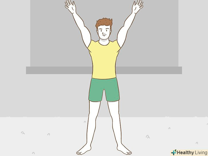 Розтягуйтеся. дуже важливо виконати розтяжку м'язів перед тим, як ви кинетеся робити колесо. Для початку вам слід розтягнути свої зап'ястя, щиколотки, а також біцепси стегна і внутрішні м'язи стегна, прийнявши положення сидячи і розкинувши ноги нарізно, після чого слід нахилятися спочатку до однієї ноги, потім до іншої, а потім вперед, намагаючись розташувати груди на підлозі. Витратьте кілька хвилин на розтяжку кистей, шляхом випрямлення однієї руки вперед і притягуючи до себе пальців цієї руки пальцями іншої руки. Щільно приставте пальці ніг до підлоги і зробіть обертальні рухи стопами спочатку однієї ноги, а потім інший.
