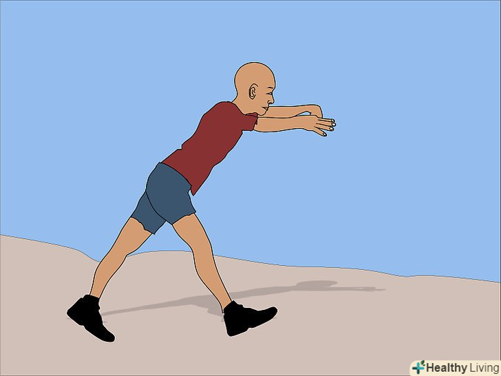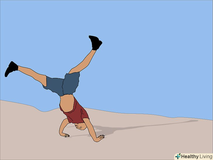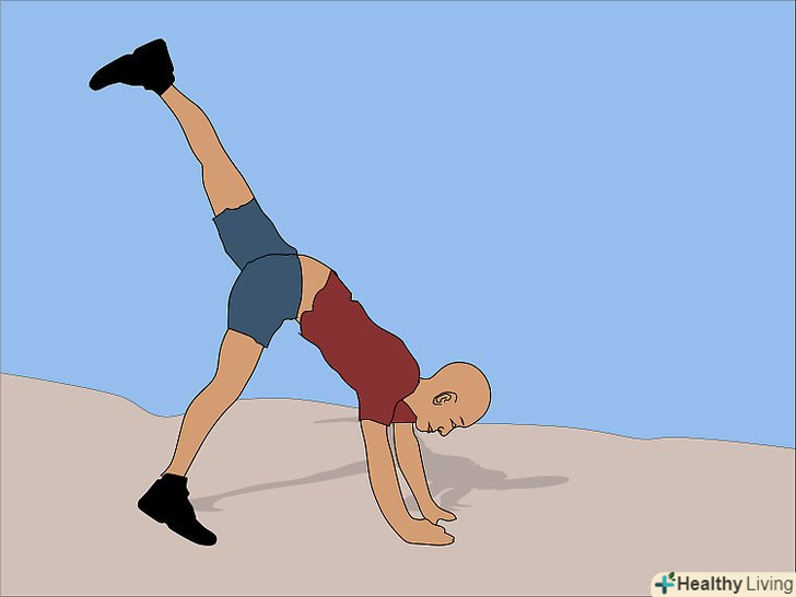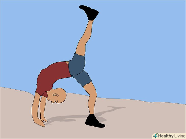 Продовжуйте переміщати стопи в однаковій відстані один від одного, спираючись на руки і, ви повинні приземлитися в місток (арочний прогин в спині), але тільки з однією стопою на землі.- Використовуйте м'язи черевного преса і інерцію, щоб вивести себе в положення стоячи, в той час як друга нога стає на землю. Також слід відштовхуватися руками від землі вгору і вперед з положення місток. Постарайтеся тримати одну ногу в повітрі під час виходження в положення стоячи , а потім витягніть її вперед, як-ніби намагаючись зробити найбільш широкий крок вперед.