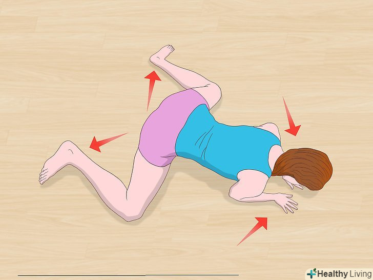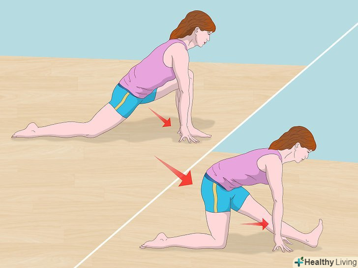 Виконайте розтяжку нижньої половини тіла. займіться розтяжкою, яку зазвичай виконують бігуни. Встаньте в випад, зробивши крок вперед однією ногою. Опустіться руками якомога нижче до підлоги. Потім підніміться, повільно випрямляючи передню ногу. Відчуйте розтяжку цієї ноги і видихніть. Поверніться назад в позу випаду і повторіть вправу. [7]- Виконуйте розтяжку бігуна для обох ніг, повторюючи вправу по 4 рази для кожної ноги.