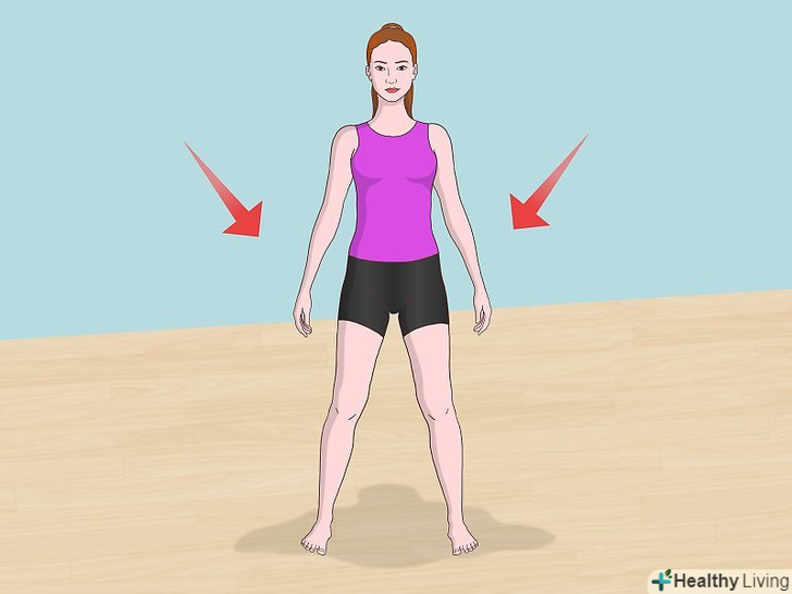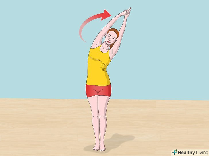 Виконайте розтяжку верхньої половини тіла. зробіть бічну розтяжку з положення стоячи. Для цього зчепите руки в замок над головою, виставивши вгору і притиснувши один до одного вказівні пальці. Зробіть вдих і почніть нахилятися вбік настільки, наскільки тільки можете. Нахиляючись, зробіть глибокий повільний видих. Затримайтеся в нахилі на 5 секунд, а потім поверніться у вихідне положення, стоячи з руками над головою. [8]- Обов'язково виконайте вищевказану бічну розтяжку в обидві сторони.