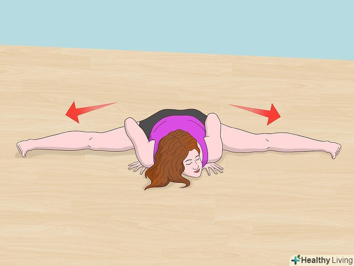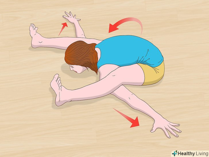 Приймайте позу черепахи. Поза черепахи дає досить інтенсивне навантаження. Сядьте прямо і розведіть ноги широко в сторони. Витягніть спину, повільно піднявши груди. Потягніть шкарпетки ніг, щоб створити напругу в ногах. Опустіть груди до підлоги, поступово відсуваючи руки вперед від тазової області. Тримайте спину прямою і нахиляйтеся вперед до відчуття розтяжки. [11]- Поглиблюючи позу, зробіть 10-15 вдихів.