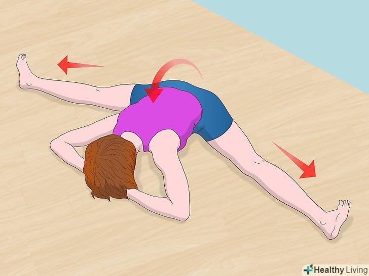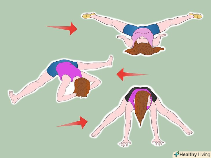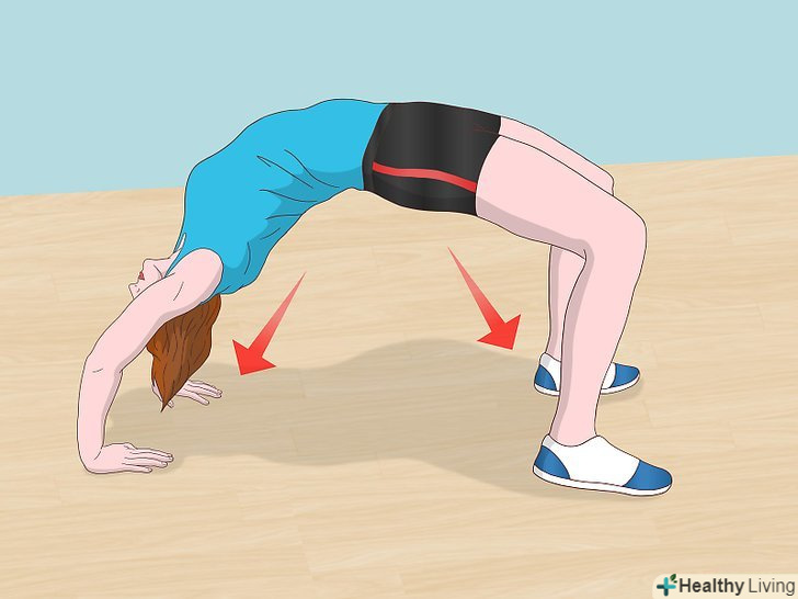 Зробіть розтяжку спини. Встаньте в місток. Для цього ляжте на спину і відштовхніться вгору руками і ногами. Зверніть увагу, що долоні і стопи повинні спиратися на підлогу, а ноги повинні бути зігнутими в колінах. Вам необхідно постаратися сформувати тілом місток, якомога вище піднявши спину над підлогою за допомогою рук і ніг. [6]- Направляйте лікті вгору до стелі і намагайтеся відчути, як ваша спина розтягується. Спочатку вставати в місток буде важко, але з плином часу і практикою ваша пластичність підвищиться. Не змушуйте себе робити що-небудь через біль. Відштовхуйтеся від підлоги для того, щоб відчути розтяжку, але не випробувати при цьому больових відчуттів.