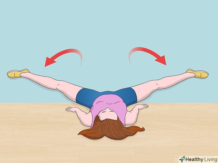 Розведіть ноги в сторони. рухаючись по стіні, повільно розведіть ноги в сторони, утворивши ними букву "V". Розведіть їх до відчуття напруги в м'язах, але не так сильно, щоб з'явився біль. Затримайтеся в позі на 10-15 секунд. [2]