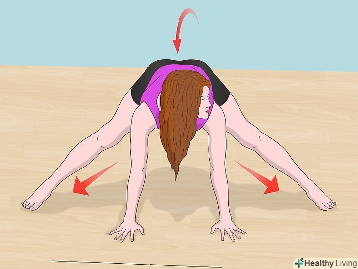 Прийміть положення стоячи. Попрактикувавшись в положенні лежачи, встаньте в комфортне положення, розставте ноги по ширині плечей і зігніться в стегнах, поставивши руки на підлогу. Робити це найкраще на кахельному або дерев'яній підлозі, попередньо переконавшись в тому, що він не дуже слизький. [3]- Босоніж вам буде зручніше контролювати рух ніг в сторони, тоді як шкарпетки можуть виявитися занадто слизькими і привести до травми.